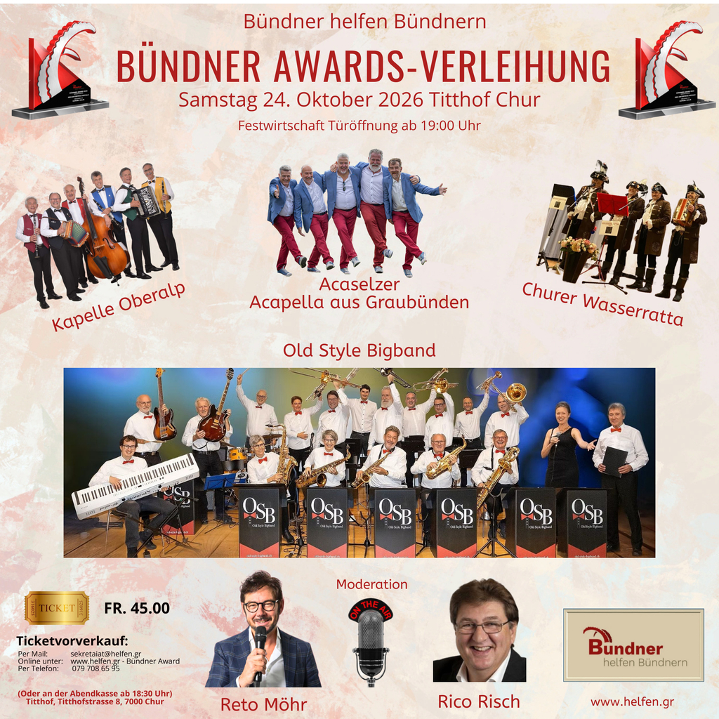 Mit einem glanzvollen Galaabend im Titthof feierte der Verein «Bündner helfen Bündnern» am 25. Oktober 2025 zum fünften Mal die Verleihung der Bündner Awards – eingebettet in das Jubiläumsjahr seines Bestehens. An diesem Abend wurden Menschen, Organisationen und Unternehmen geehrt, deren aussergewöhnliches Engagement das Leben armutsbetroffener oder in Not geratener Mitbürgerinnen und Mitbürger im Kanton Graubünden nachhaltig verbessert hatte. Der Anlass stand ganz im Zeichen von Solidarität und Nächstenliebe: Musik, Poetry Slam und Showeinlagen vermittelten eindrucksvoll die Botschaft des Vereins – Helfen heisst Hoffnung schenken.
